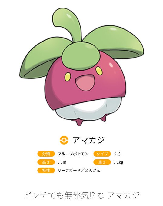 Jul 19, 167月19日にサンムーンの新ポケモン『アマカジ』が公開されました。 スポンサーリンク 目次アマカジ分類高さ重さタイプ特性紹介文アマカジの評価 アマカジ 分類 フルーツポケモン 高さ 03m 重さ 32kg・・・©21 Pokémon © Nintendo / Creatures Inc / GAME FREAK inc ポケットモンスター・ポケモン・Pokémonは任天堂・クリーチャーズ・ゲームフリークの登録商標です。 ※このホームページに掲載されている内容の著作権は株式会社ポケモンに帰属します。 このホームデータ ・名前:アマカジ ・分類:フルーツポケモン ・タイプ:くさ ・高さ:03m ・重さ:32kg ・特性:リーフガード